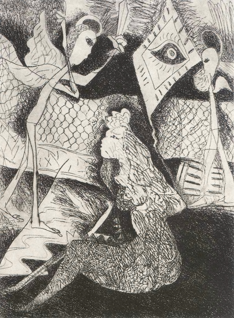 Con un aire jovial y tierno, dentro de una veta figurativa, plasma una meditación y paródica sobre un tema religioso con una simbología tradicionalmente aceptada. Un ángel, de pie, levanta la espada ante una joven de larga melena, sentada en el césped, bajo la mirada supervisora de un ojo insertado en un rombo que flota en el aire. Al fondo otro ángel y un pretil alambrado tras el que continúa el espacio. Manchas negras juegan con el blanco del papel creando sombras de efecto pictórico.