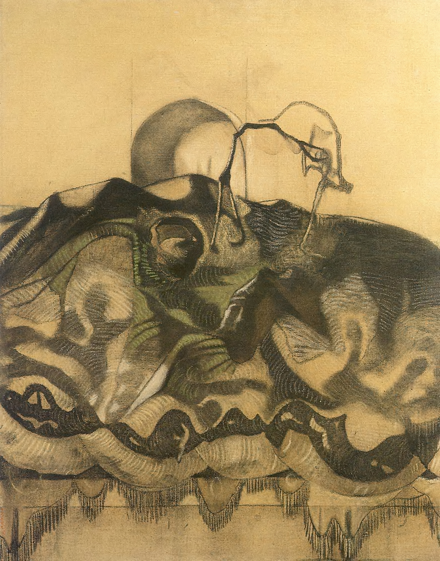 Sobre una mesa se amontonan una serie de telas, desbordando el límite de la misma, en el primer término, muy cerca del espectador, sobre un fondo liso en el que se abre una arcada. Curvas, estrías y sombras laberínticas se suman y contraponen, creando una masa orgánica a punto de realizar una metamorfosis. El rítmico movimiento inestable que presenta la ropa, se activa con el colorido, en el que apenas utiliza materia, logrando sugerentes efectos de arrugas y dobleces con ocres, verdes y negros.