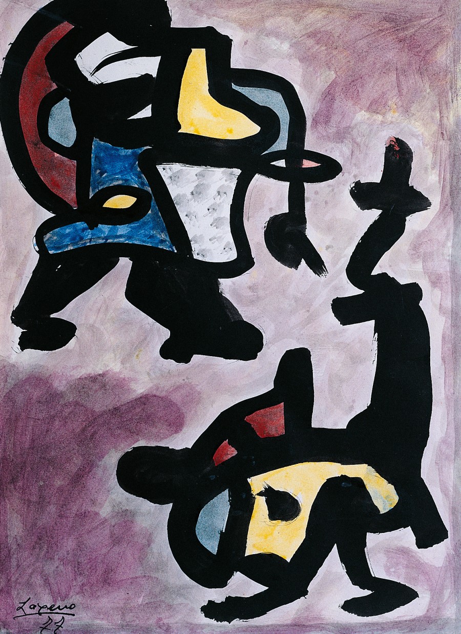 Signos, Arabescos, puntos, rayas, trazos insignificantes, se configuran dentro de un contorno negro, con hachazos de color determinados por movimientos rápidos y enérgicos.