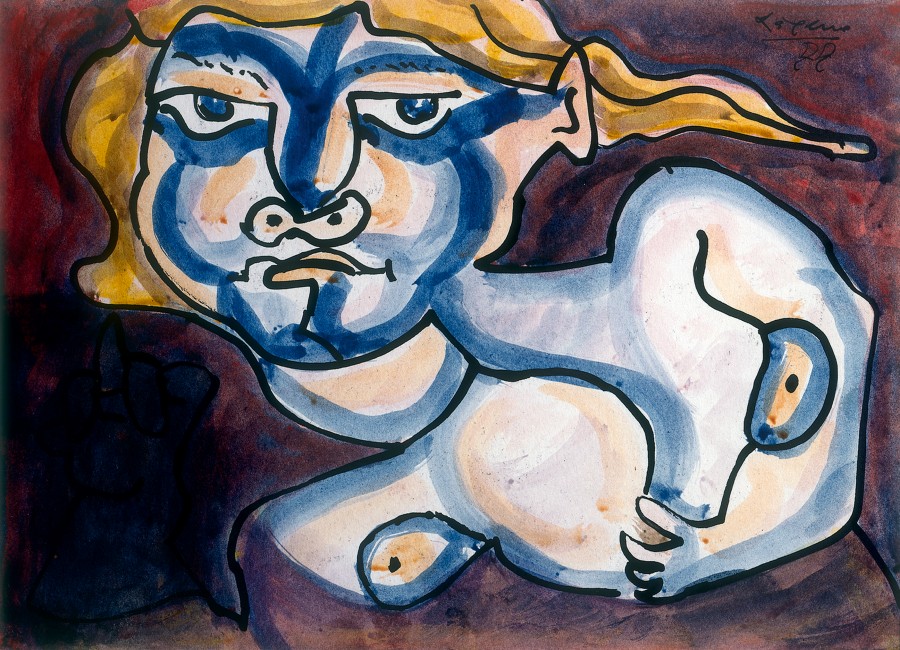 Treinta y nueve obras de la serie, que el pintor denomina «Dibujos a tinta china, coloreados», de 25 x 18 cms. y 33 x 25 cms., firmados todos, y fechados en el 77, diecisiete, en el 76, uno, y en el 78, otro; el resto sin fechar. En este conjunto de obras maestras, con un lenguaje polivante, hace alarde de su gran capacidad para componer y trazar líneas, creando ambientes y confiando en la fuerza expresiva del gesto y el color. Para acercarnos a estos dibujos, todas las propuestas son válidas, ninguna es exclusiva, su lenguaje sugiere mundos diferentes a cada espectador. Por expreso deseo de su autor, no analizamos estas obras separadamente, las agrupamos por motivos, indicando ciertos rasgos comunes a algunas, y especificando determinadas características en otras. Mujeres, erguidas o tumbadas, solas o en parejas, cabezas o bustos, con líneas esquemáticas puras, con alusiones surrealistas, o con expresiones dramáticas de inspiración picassiana. Figuras, que se desarticulan y despiezan en tono burlón e irónico, respondiendo a la estética propia del mundo del ensueño del pintor. Pequeños Monstruos, expresivos y sardónicos, con cabezas enormes, cuyos rostros, grotescos, se abren en dos piezas como si tuvieran figuras, descubriendo espacios que de otro modo no existirían. Gigantes, sere irreales, con una fuerza misteriosa, de carácter totémico, de gran valor plástico. Grupos, de figuras y de formas enlazadas, comprimidos en estrechos espacios, a punto de estallar con furiosa energía fuera del marco del papel. Signos, Arabescos, puntos, rayas, trazos insignificantes, se configuran dentro de un contorno negro, con hachazos de color determinados por movimientos rápidos y enérgicos. Formas Fluctuantes, sobre un espacio oscuro, sugiriendo posibilidades de cambio, y trasladándonos al mundo mágico, abstracto, de lo imaginativo. Se incluyen en esta serie: «Un árbol», de exquisita sensibilidad, «Un búho», de intensa mirada, «Un Cristo», sentado, vivo, fuera de la iconografía habitual; dos gaiteros, uno, barbudo, con figuración clásica, el otro, con líneas esquemáticas, muy expresivos los dos. Temas narrativos, como «La familia que abandona la aldea», caminando en primer término, en bonita contraposición con la casa que deja al fondo. «Mujer con bastón», «La Avelina», figura corpulenta, que se impone andando, produciendo la impresión de que al paso siguiente va a salir del cuadro. Hace referencia a temas clásicos de la Pintura. En «Familia sobre la hierba», combina una mujer desnuda con un hombre vestido, tema abordado por los impresionistas, glosado por Picasso y que antes había presentado Giorgone. Con la agresiva expresividad del blanco y negro, contrastando con un friso de árboles, pinta «Mujeres tumbadas sobre negro», evocación de «Las Doncellas a la orilla del Sena» de Courbet, glosadas también por Picasso. «Mujer sentada en un sillón es un recuerdo de «La mujer turca», de Matisse. Por último, «Dos figuras», contrapuestas en un espacio mágico, con una misteriosa comunicación entre ellas, de clara influencia mironiana. M. L. I. J.