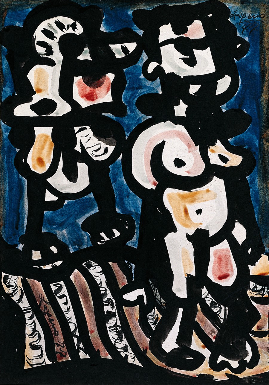Grupos, de figuras y de formas enlazadas, comprimidos en estrechos espacios, a punto de estallar con furiosa energía fuera del marco del papel.