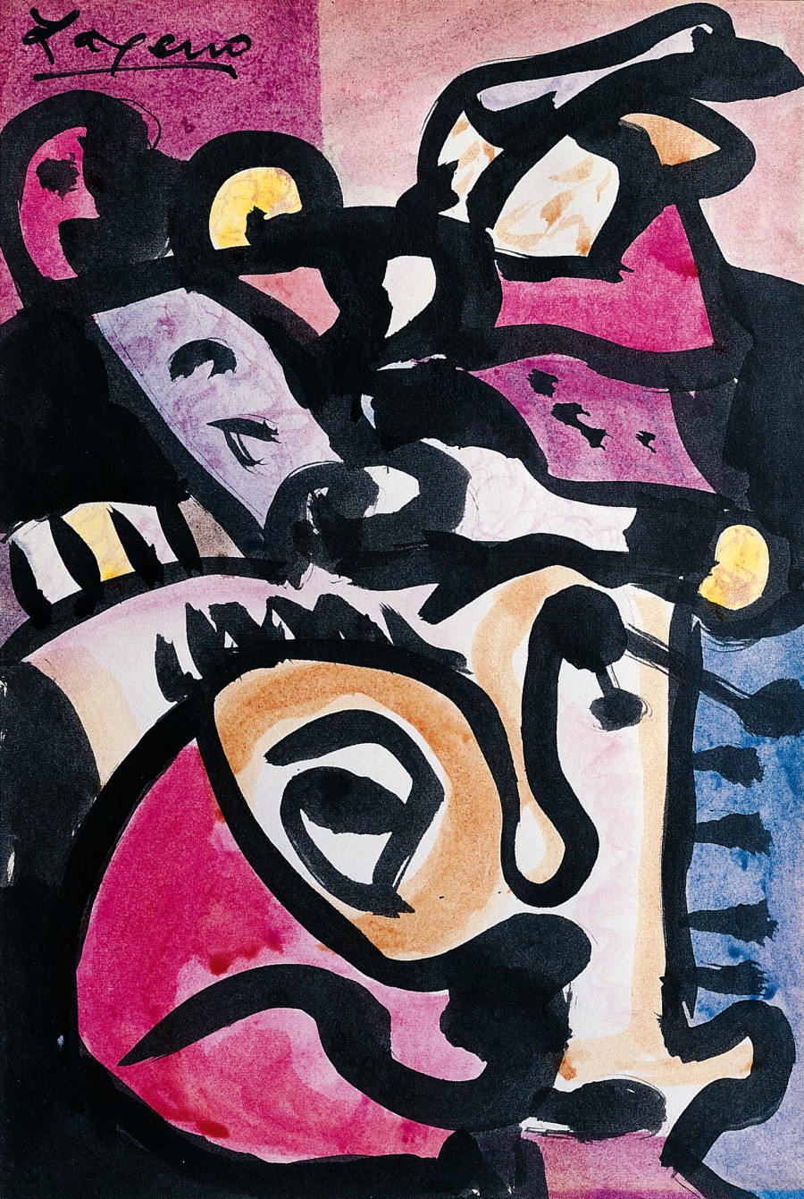 Treinta y nueve obras de la serie, que el pintor denomina «Dibujos a tinta china, coloreados», de 25 x 18 cms. y 33 x 25 cms., firmados todos, y fechados en el 77, diecisiete, en el 76, uno, y en el 78, otro; el resto sin fechar. En este conjunto de obras maestras, con un lenguaje polivante, hace alarde de su gran capacidad para componer y trazar líneas, creando ambientes y confiando en la fuerza expresiva del gesto y el color. Para acercarnos a estos dibujos, todas las propuestas son válidas, ninguna es exclusiva, su lenguaje sugiere mundos diferentes a cada espectador. Por expreso deseo de su autor, no analizamos estas obras separadamente, las agrupamos por motivos, indicando ciertos rasgos comunes a algunas, y especificando determinadas características en otras. Mujeres, erguidas o tumbadas, solas o en parejas, cabezas o bustos, con líneas esquemáticas puras, con alusiones surrealistas, o con expresiones dramáticas de inspiración picassiana. Figuras, que se desarticulan y despiezan en tono burlón e irónico, respondiendo a la estética propia del mundo del ensueño del pintor. Pequeños Monstruos, expresivos y sardónicos, con cabezas enormes, cuyos rostros, grotescos, se abren en dos piezas como si tuvieran figuras, descubriendo espacios que de otro modo no existirían. Gigantes, sere irreales, con una fuerza misteriosa, de carácter totémico, de gran valor plástico. Grupos, de figuras y de formas enlazadas, comprimidos en estrechos espacios, a punto de estallar con furiosa energía fuera del marco del papel. Signos, Arabescos, puntos, rayas, trazos insignificantes, se configuran dentro de un contorno negro, con hachazos de color determinados por movimientos rápidos y enérgicos. Formas Fluctuantes, sobre un espacio oscuro, sugiriendo posibilidades de cambio, y trasladándonos al mundo mágico, abstracto, de lo imaginativo. Se incluyen en esta serie: «Un árbol», de exquisita sensibilidad, «Un búho», de intensa mirada, «Un Cristo», sentado, vivo, fuera de la iconografía habitual; dos gaiteros, uno, barbudo, con figuración clásica, el otro, con líneas esquemáticas, muy expresivos los dos. Temas narrativos, como «La familia que abandona la aldea», caminando en primer término, en bonita contraposición con la casa que deja al fondo. «Mujer con bastón», «La Avelina», figura corpulenta, que se impone andando, produciendo la impresión de que al paso siguiente va a salir del cuadro. Hace referencia a temas clásicos de la Pintura. En «Familia sobre la hierba», combina una mujer desnuda con un hombre vestido, tema abordado por los impresionistas, glosado por Picasso y que antes había presentado Giorgone. Con la agresiva expresividad del blanco y negro, contrastando con un friso de árboles, pinta «Mujeres tumbadas sobre negro», evocación de «Las Doncellas a la orilla del Sena» de Courbet, glosadas también por Picasso. «Mujer sentada en un sillón es un recuerdo de «La mujer turca», de Matisse. Por último, «Dos figuras», contrapuestas en un espacio mágico, con una misteriosa comunicación entre ellas, de clara influencia mironiana. M. L. I. J.