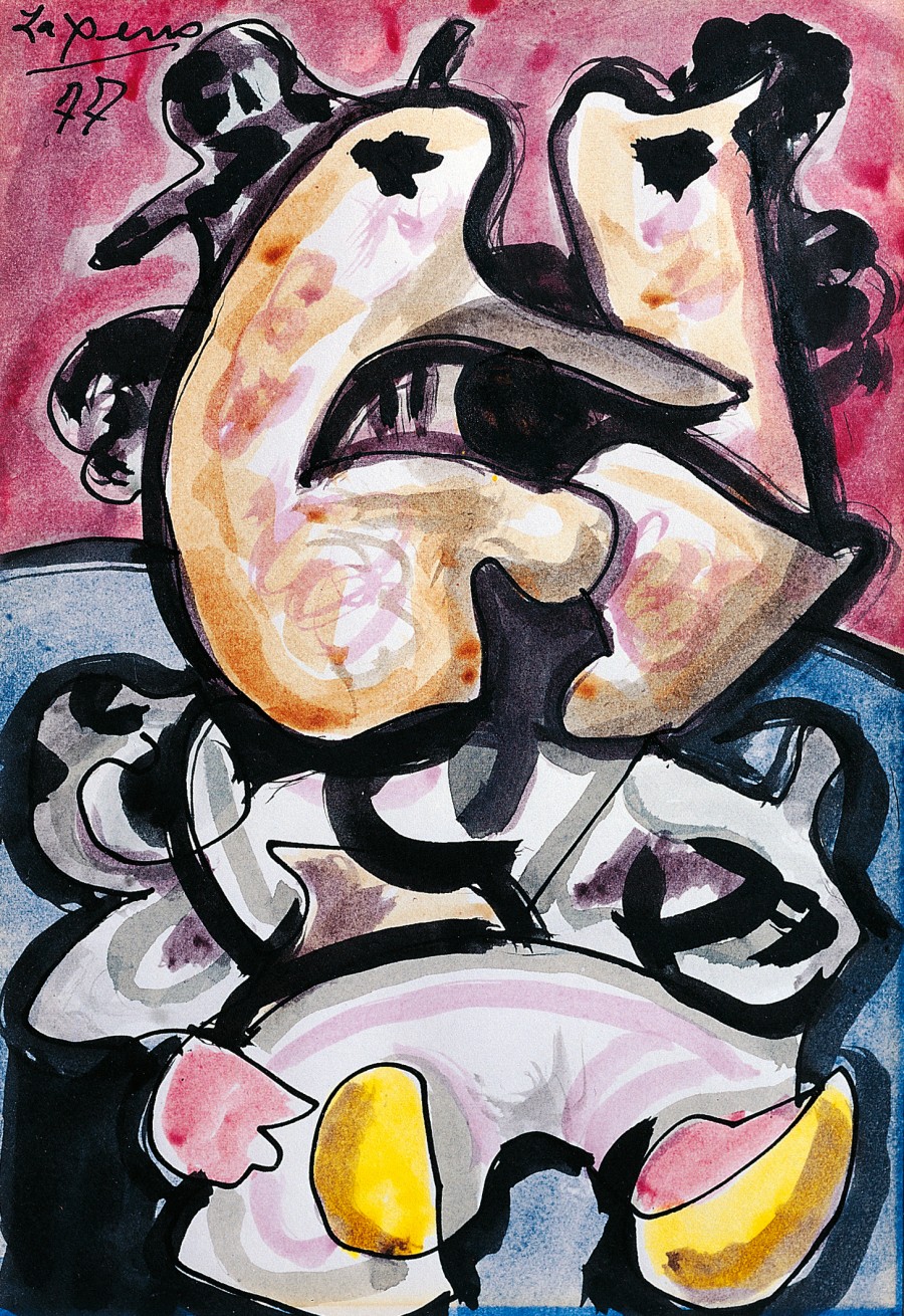 Treinta y nueve obras de la serie, que el pintor denomina «Dibujos a tinta china, coloreados», de 25 x 18 cms. y 33 x 25 cms., firmados todos, y fechados en el 77, diecisiete, en el 76, uno, y en el 78, otro; el resto sin fechar. En este conjunto de obras maestras, con un lenguaje polivante, hace alarde de su gran capacidad para componer y trazar líneas, creando ambientes y confiando en la fuerza expresiva del gesto y el color. Para acercarnos a estos dibujos, todas las propuestas son válidas, ninguna es exclusiva, su lenguaje sugiere mundos diferentes a cada espectador. Por expreso deseo de su autor, no analizamos estas obras separadamente, las agrupamos por motivos, indicando ciertos rasgos comunes a algunas, y especificando determinadas características en otras. Mujeres, erguidas o tumbadas, solas o en parejas, cabezas o bustos, con líneas esquemáticas puras, con alusiones surrealistas, o con expresiones dramáticas de inspiración picassiana. Figuras, que se desarticulan y despiezan en tono burlón e irónico, respondiendo a la estética propia del mundo del ensueño del pintor. Pequeños Monstruos, expresivos y sardónicos, con cabezas enormes, cuyos rostros, grotescos, se abren en dos piezas como si tuvieran figuras, descubriendo espacios que de otro modo no existirían. Gigantes, sere irreales, con una fuerza misteriosa, de carácter totémico, de gran valor plástico. Grupos, de figuras y de formas enlazadas, comprimidos en estrechos espacios, a punto de estallar con furiosa energía fuera del marco del papel. Signos, Arabescos, puntos, rayas, trazos insignificantes, se configuran dentro de un contorno negro, con hachazos de color determinados por movimientos rápidos y enérgicos. Formas Fluctuantes, sobre un espacio oscuro, sugiriendo posibilidades de cambio, y trasladándonos al mundo mágico, abstracto, de lo imaginativo. Se incluyen en esta serie: «Un árbol», de exquisita sensibilidad, «Un búho», de intensa mirada, «Un Cristo», sentado, vivo, fuera de la iconografía habitual; dos gaiteros, uno, barbudo, con figuración clásica, el otro, con líneas esquemáticas, muy expresivos los dos. Temas narrativos, como «La familia que abandona la aldea», caminando en primer término, en bonita contraposición con la casa que deja al fondo. «Mujer con bastón», «La Avelina», figura corpulenta, que se impone andando, produciendo la impresión de que al paso siguiente va a salir del cuadro. Hace referencia a temas clásicos de la Pintura. En «Familia sobre la hierba», combina una mujer desnuda con un hombre vestido, tema abordado por los impresionistas, glosado por Picasso y que antes había presentado Giorgone. Con la agresiva expresividad del blanco y negro, contrastando con un friso de árboles, pinta «Mujeres tumbadas sobre negro», evocación de «Las Doncellas a la orilla del Sena» de Courbet, glosadas también por Picasso. «Mujer sentada en un sillón es un recuerdo de «La mujer turca», de Matisse. Por último, «Dos figuras», contrapuestas en un espacio mágico, con una misteriosa comunicación entre ellas, de clara influencia mironiana. M. L. I. J.