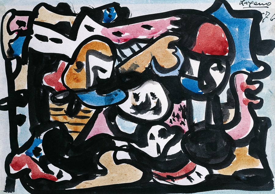 Treinta y nueve obras de la serie, que el pintor denomina «Dibujos a tinta china, coloreados», de 25 x 18 cms. y 33 x 25 cms., firmados todos, y fechados en el 77, diecisiete, en el 76, uno, y en el 78, otro; el resto sin fechar. En este conjunto de obras maestras, con un lenguaje polivante, hace alarde de su gran capacidad para componer y trazar líneas, creando ambientes y confiando en la fuerza expresiva del gesto y el color. Para acercarnos a estos dibujos, todas las propuestas son válidas, ninguna es exclusiva, su lenguaje sugiere mundos diferentes a cada espectador. Por expreso deseo de su autor, no analizamos estas obras separadamente, las agrupamos por motivos, indicando ciertos rasgos comunes a algunas, y especificando determinadas características en otras. Mujeres, erguidas o tumbadas, solas o en parejas, cabezas o bustos, con líneas esquemáticas puras, con alusiones surrealistas, o con expresiones dramáticas de inspiración picassiana. Figuras, que se desarticulan y despiezan en tono burlón e irónico, respondiendo a la estética propia del mundo del ensueño del pintor. Pequeños Monstruos, expresivos y sardónicos, con cabezas enormes, cuyos rostros, grotescos, se abren en dos piezas como si tuvieran figuras, descubriendo espacios que de otro modo no existirían. Gigantes, sere irreales, con una fuerza misteriosa, de carácter totémico, de gran valor plástico. Grupos, de figuras y de formas enlazadas, comprimidos en estrechos espacios, a punto de estallar con furiosa energía fuera del marco del papel. Signos, Arabescos, puntos, rayas, trazos insignificantes, se configuran dentro de un contorno negro, con hachazos de color determinados por movimientos rápidos y enérgicos. Formas Fluctuantes, sobre un espacio oscuro, sugiriendo posibilidades de cambio, y trasladándonos al mundo mágico, abstracto, de lo imaginativo. Se incluyen en esta serie: «Un árbol», de exquisita sensibilidad, «Un búho», de intensa mirada, «Un Cristo», sentado, vivo, fuera de la iconografía habitual; dos gaiteros, uno, barbudo, con figuración clásica, el otro, con líneas esquemáticas, muy expresivos los dos. Temas narrativos, como «La familia que abandona la aldea», caminando en primer término, en bonita contraposición con la casa que deja al fondo. «Mujer con bastón», «La Avelina», figura corpulenta, que se impone andando, produciendo la impresión de que al paso siguiente va a salir del cuadro. Hace referencia a temas clásicos de la Pintura. En «Familia sobre la hierba», combina una mujer desnuda con un hombre vestido, tema abordado por los impresionistas, glosado por Picasso y que antes había presentado Giorgone. Con la agresiva expresividad del blanco y negro, contrastando con un friso de árboles, pinta «Mujeres tumbadas sobre negro», evocación de «Las Doncellas a la orilla del Sena» de Courbet, glosadas también por Picasso. «Mujer sentada en un sillón es un recuerdo de «La mujer turca», de Matisse. Por último, «Dos figuras», contrapuestas en un espacio mágico, con una misteriosa comunicación entre ellas, de clara influencia mironiana. M. L. I. J.