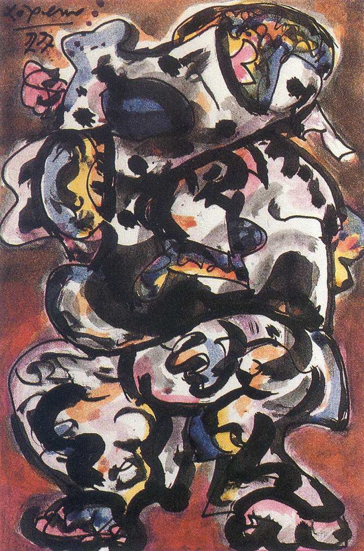 Treinta y nueve obras de la serie, que el pintor denomina «Dibujos a tinta china, coloreados», de 25 x 18 cms. y 33 x 25 cms., firmados todos, y fechados en el 77, diecisiete, en el 76, uno, y en el 78, otro; el resto sin fechar. En este conjunto de obras maestras, con un lenguaje polivante, hace alarde de su gran capacidad para componer y trazar líneas, creando ambientes y confiando en la fuerza expresiva del gesto y el color. Para acercarnos a estos dibujos, todas las propuestas son válidas, ninguna es exclusiva, su lenguaje sugiere mundos diferentes a cada espectador. Por expreso deseo de su autor, no analizamos estas obras separadamente, las agrupamos por motivos, indicando ciertos rasgos comunes a algunas, y especificando determinadas características en otras. Mujeres, erguidas o tumbadas, solas o en parejas, cabezas o bustos, con líneas esquemáticas puras, con alusiones surrealistas, o con expresiones dramáticas de inspiración picassiana. Figuras, que se desarticulan y despiezan en tono burlón e irónico, respondiendo a la estética propia del mundo del ensueño del pintor. Pequeños Monstruos, expresivos y sardónicos, con cabezas enormes, cuyos rostros, grotescos, se abren en dos piezas como si tuvieran figuras, descubriendo espacios que de otro modo no existirían. Gigantes, sere irreales, con una fuerza misteriosa, de carácter totémico, de gran valor plástico. Grupos, de figuras y de formas enlazadas, comprimidos en estrechos espacios, a punto de estallar con furiosa energía fuera del marco del papel. Signos, Arabescos, puntos, rayas, trazos insignificantes, se configuran dentro de un contorno negro, con hachazos de color determinados por movimientos rápidos y enérgicos. Formas Fluctuantes, sobre un espacio oscuro, sugiriendo posibilidades de cambio, y trasladándonos al mundo mágico, abstracto, de lo imaginativo. Se incluyen en esta serie: «Un árbol», de exquisita sensibilidad, «Un búho», de intensa mirada, «Un Cristo», sentado, vivo, fuera de la iconografía habitual; dos gaiteros, uno, barbudo, con figuración clásica, el otro, con líneas esquemáticas, muy expresivos los dos. Temas narrativos, como «La familia que abandona la aldea», caminando en primer término, en bonita contraposición con la casa que deja al fondo. «Mujer con bastón», «La Avelina», figura corpulenta, que se impone andando, produciendo la impresión de que al paso siguiente va a salir del cuadro. Hace referencia a temas clásicos de la Pintura. En «Familia sobre la hierba», combina una mujer desnuda con un hombre vestido, tema abordado por los impresionistas, glosado por Picasso y que antes había presentado Giorgone. Con la agresiva expresividad del blanco y negro, contrastando con un friso de árboles, pinta «Mujeres tumbadas sobre negro», evocación de «Las Doncellas a la orilla del Sena» de Courbet, glosadas también por Picasso. «Mujer sentada en un sillón es un recuerdo de «La mujer turca», de Matisse. Por último, «Dos figuras», contrapuestas en un espacio mágico, con una misteriosa comunicación entre ellas, de clara influencia mironiana. M. L. I. J.