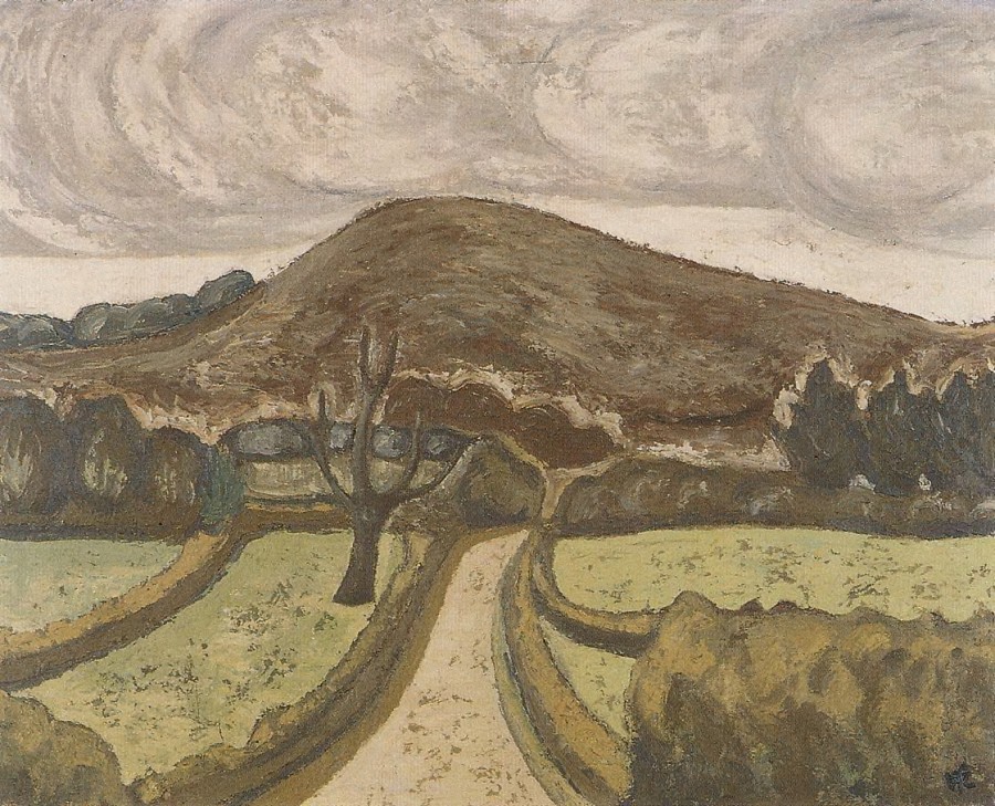 El dibujo, esquemático, estiliza los motivos del paisaje, acentuando su valor expresivo. La estructura se centra en el camino que se abre entre campos, en el primer término, y nos invita a adentrarnos en el cuadro, ascendiendo hacia una arboleda, al pie de la montaña sobre la que se extiende una hermosa masa de nubes. El rigor del diseño, seduce y arrastra al que lo contempla hacia el fondo del paisaje en el que dominan los tonos sombríos, trabajados con densa materia en armonía de verdes, ocres y grises que se iluminan con el color blanquecino que bordea el horizonte.