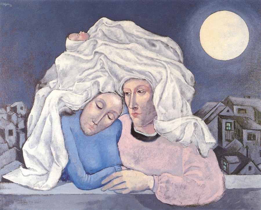 Dos figuras con un bebé sobre sus cabezas, se apoyan en un muro que tienen delante como si estuvieran asomadas a una ventana; al fondo, casas y un cielo limpio en el que brilla la luna. Las tres figuras se unen con un movimiento encadenado a través de las cabezas, las manos, y el ropaje del niño que, con un grafismo lleno de inflexiones, engloba a los tres cuerpos en una atmósfera de calor humano. La articulación espacial y la riqueza de los paños se unen al luminoso colorido, en una composición con recuerdos de Bellini y de los pintores góticos flamecos.