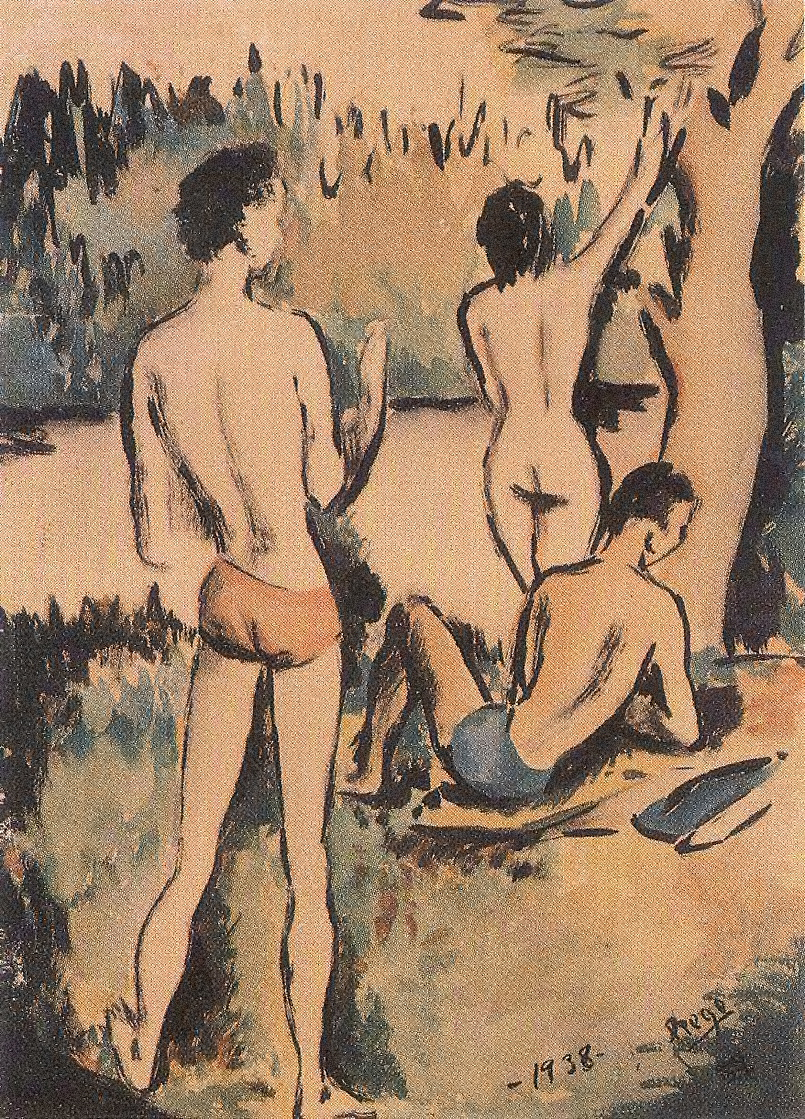 Dos hombres en traje de baño, y una mujer completamente desnuda, de espaldas, a la orilla de un río, que fluye al fondo. Las figuras, diseñadas con rigurosa búsqueda lineal, se integran en la naturaleza, con evidentes recuerdos cezannianos, comparando el árbol con el desnudo femenino, como elementos de una misma arquitectura. Manchas verdes, azules y amarillas, se combinan con el contorno negro que perfila las figuras.
