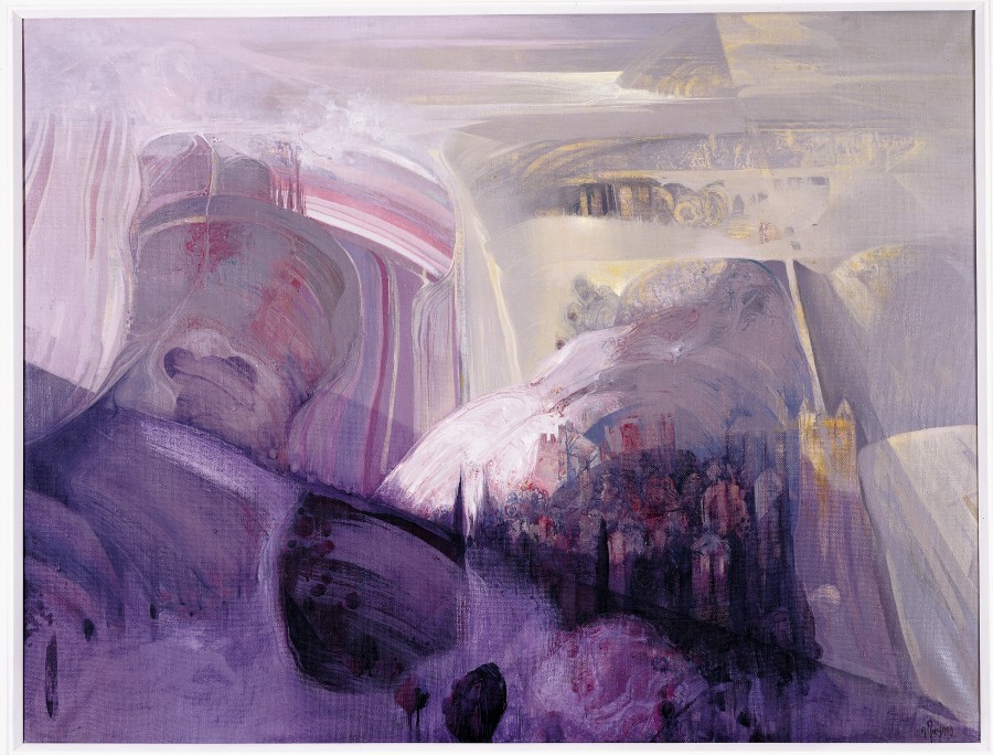 Juega con el cromatismo y las calidades, creando espejismos de formas y construcciones fantásticas, dejándose llevar por el instinto pictórico con veladuras, transparencias y goteo, en armonía de morados, amarillos, ocres, verdes y negros, sobre los que se imponen ráfagas de pintura blanca.