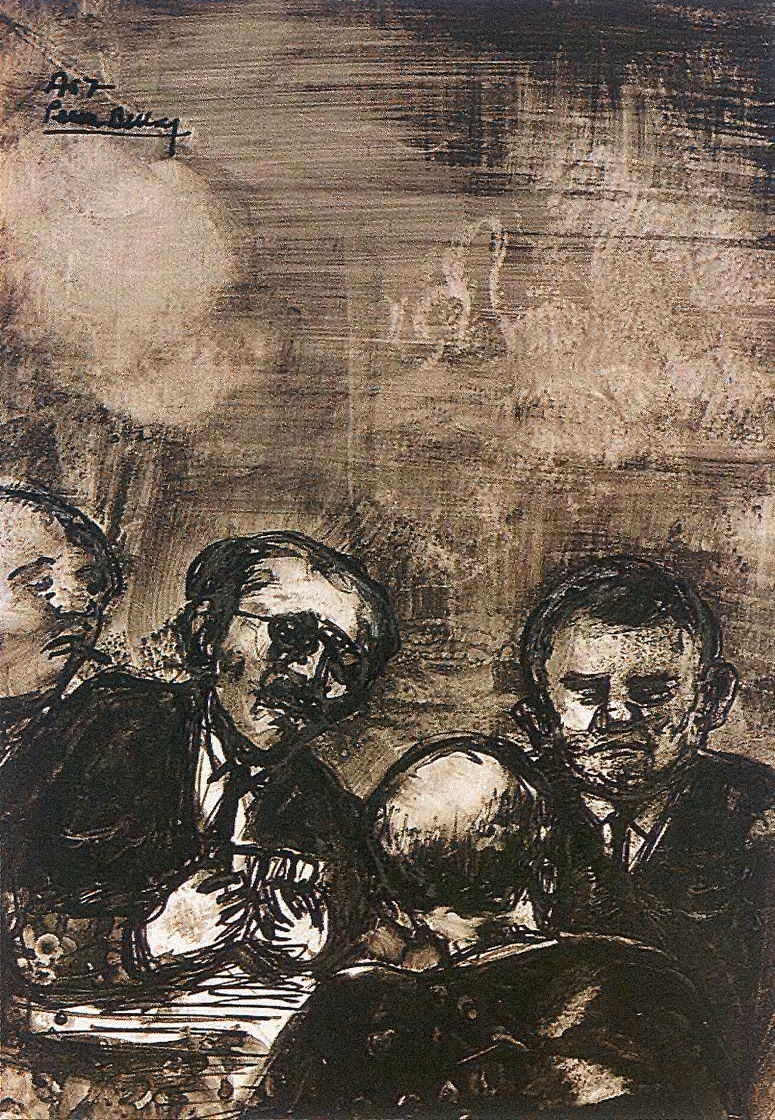 Cuatro figuras se agrupan en la parte inferior de la composiciòn en torno a una partida de cartas. Trazos decisivos y rotundos definen las diferentes actitudes de los personajes, caracterizados individualmente con rasgos distintivos. Gafas, cigarrillo, corbata y calvicie son atributos de una determinada clase social que caricaturiza con ironía.