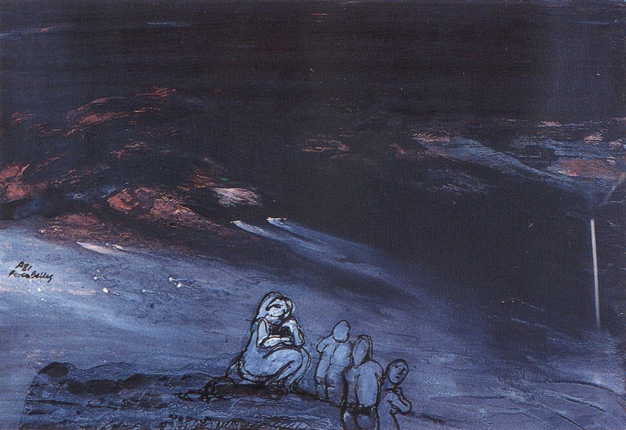 Varias figuras desnudas, se agrupan orientadas hacia el fondo de un paisaje, oculto en la penumbra de la noche. Sus cuerpos, silueteados con trazos fluidos, destacan iluminados por un lívido reflejo que contrasta con los negros y rojizos del fondo, en cuya misteriosa oscuridad se prepara la mañana. Con una estética de silencio y meditación, crea una escena cargada de sugerencias de profundo contenido.