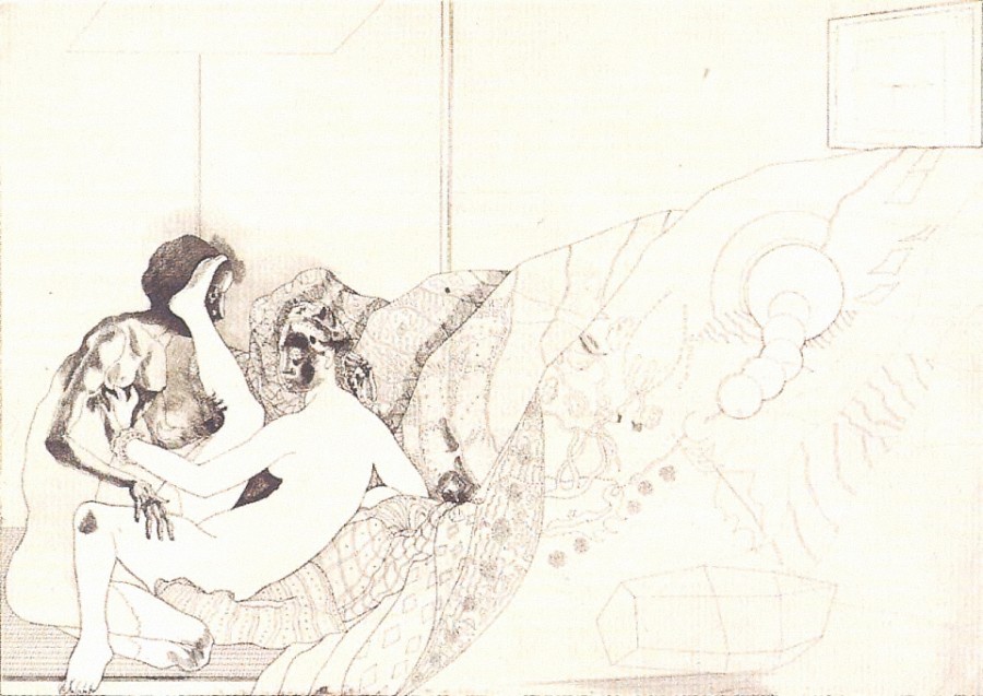 Ocho aguafuertes, firmados en el año 74, en plena madurez de su obra gráfica. Se estructuran con un entramado de verticales, horizontales y una signografía de círculos, rayas, manchas, elementos vegetales y animales, que forman parte de un universo, personal, entre lo real y lo imaginativo. Enlaza con la tradición clásica, de la que extrae claves y datos plásticos con los que constuye sus propias visiones, a las que dota de una poética propia, innovadora, llena de lirismo. Da vida a antiguas mitologías, estableciendo un juego de relaciones entre lo masculino y femenino vivido en el rito sexual de los amantes, contrastando la belleza de la mujer y la agresividad del hombre desnudo, en el ámbito de una estancia íntima en la que destaca un lecho de telas y tapices, con carga de erotismo, enfatizada con acentos surrealistas y la sensibilidad hacia lo grotesco. Al estilo de Bacon, concibe un personaje sentado, dentro de una estructura geométrica abierta, que, a modo de jaula transparente, lo aisla de su entorno, con un concepto escénico del espacio. Las cualidades abstractas de la línea de Ingres y sus formas, son valoradas por el artista, que se recrea en la pureza del trazo que atraviesa la superficie vacía del papel y con sólo un contorno, sin modelado, da cuerpo a una silueta, detallando su tocado, con un inconfesable parentesco con odaliscas y sultanas. Dentro de la serie "Variaciones sobre Ingres" destaca la bella evocación de "Masemoiselle Riviére" reinterpretación casi elegíaca del tema, resucitando un motivo clásico con lucidez formal y concisión en la narración. La figura, encerrada en el óvalo del marco, se recorta sobre el paisaje lacustre conservando su elegancia intacta en un escenario de múltiples acentos surrealistas. Las sombras empañan su rostro, como si la memoria se negase a seguir recordando, rodeándola de una serie de símbolos cuya expresión en su capacidad de misterio que la convierte en algo trascendente, demostrando que todo es susceptible de ser replanteado, que nada queda definitivamente resuelto en el arte. M. L. I. J.