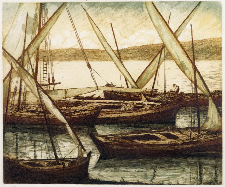 Al ambiente silente y reposado que sugieren el mar, tranquilo, y las barcas, vacías, se opone el calculado juego de mástiles que se cruzan y enlazan, dejando entre ellos espacios vacíos de gran tensión. El uso de dos tintas y la degradación de sombras, producen un efecto pictórico logrado con dominio del oficio.: