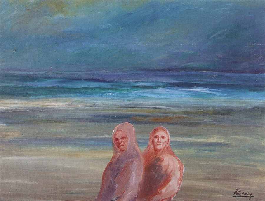 Dos figuras femeninas de tres cuartos destacan en primer término, cubiertas con mantos que subrayan sus siluetas, perfiladas con trazos rojizos sobre el mar. La tensión parte de las figuras, de turbado semblante, y aumenta con el color denso del cielo y el mar, en empasten grises, azules, y verdes con toques blancos, esparcidos ampliamente por toda la superficie pictórica, con perfecta coherencia entre la naturaleza y las emociones de los personajes.