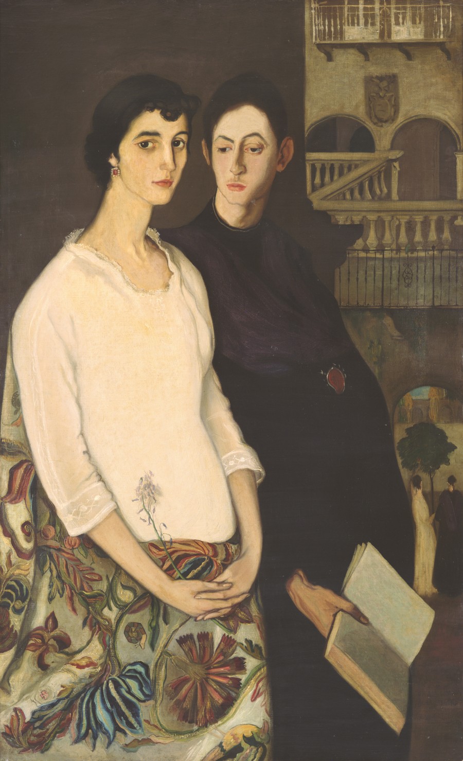 Las figuras, diseñadas con un cánon alargado, marierista, destacan, en primer término, iluminadas por una fuerte luz que acentúa la palidez de sus rostros y modela las carnaciones con un suave claroscuro. La joven, con expresión dulce y melancólica a la vez, enlaza sus manos por delante y sujeta un cortinaje con el que cubre su grávido vientre, a su lado, con la mirada baja, el confidente de sus penas. Entre la zona oscura que respalda a las figuras y la perspectiva de la plaza, se crea un ambiente de misterioso contenido espiritual. A la paleta contrastada de blanco y negros, se une, sin estridencia la policromía del cortinaje, de gran valor decorativo. Este viejo recurso, utilizado con originalidad, aumenta el valor de la composición, ejecutada con técnica impecable.