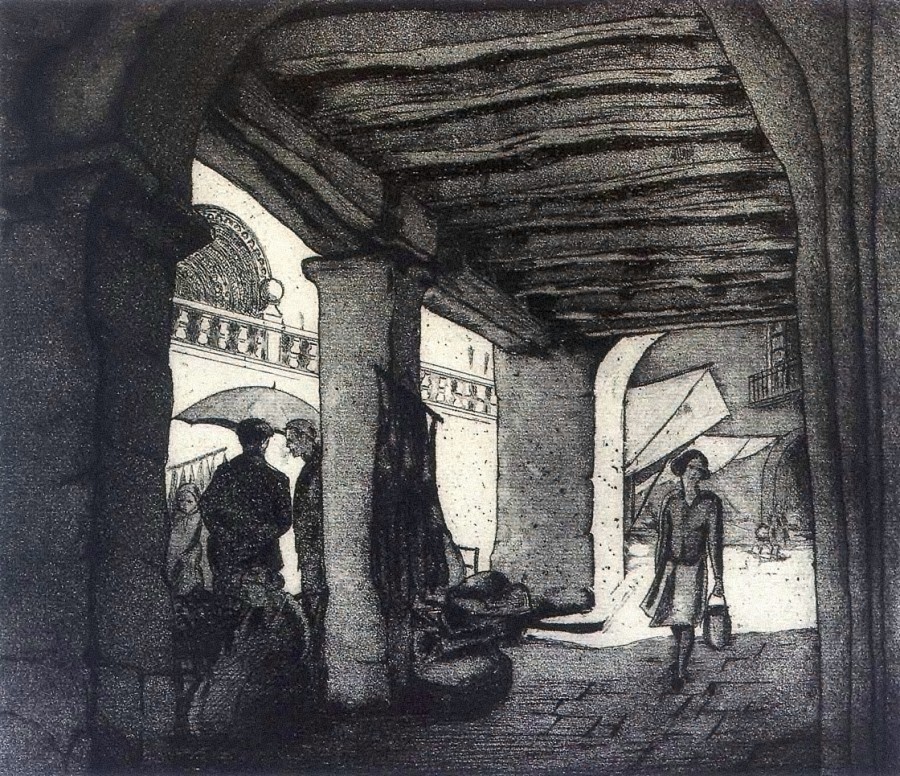 El encuadramiento arquitectónico, estructurado con verticales y horizontales, da solidez a la composición, diseñada con un bello efecto de perspectiva. Con un meticuloso trabajo de líneas, logra un fuerte contraste de luces y sombras que dan volumen a los porches. Las figuras, anecdóticas, animan la escena.