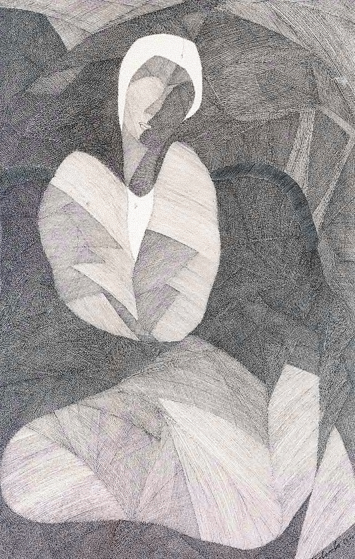 Sobre una trama estructural en la que se distinguen formas geométricas, con un lenguaje próximo al cubismo, finísimas líneas negras se juntan y separan creando luces y sombras que modelan el volumen de la figura, con un valor esencialmente decorativo.