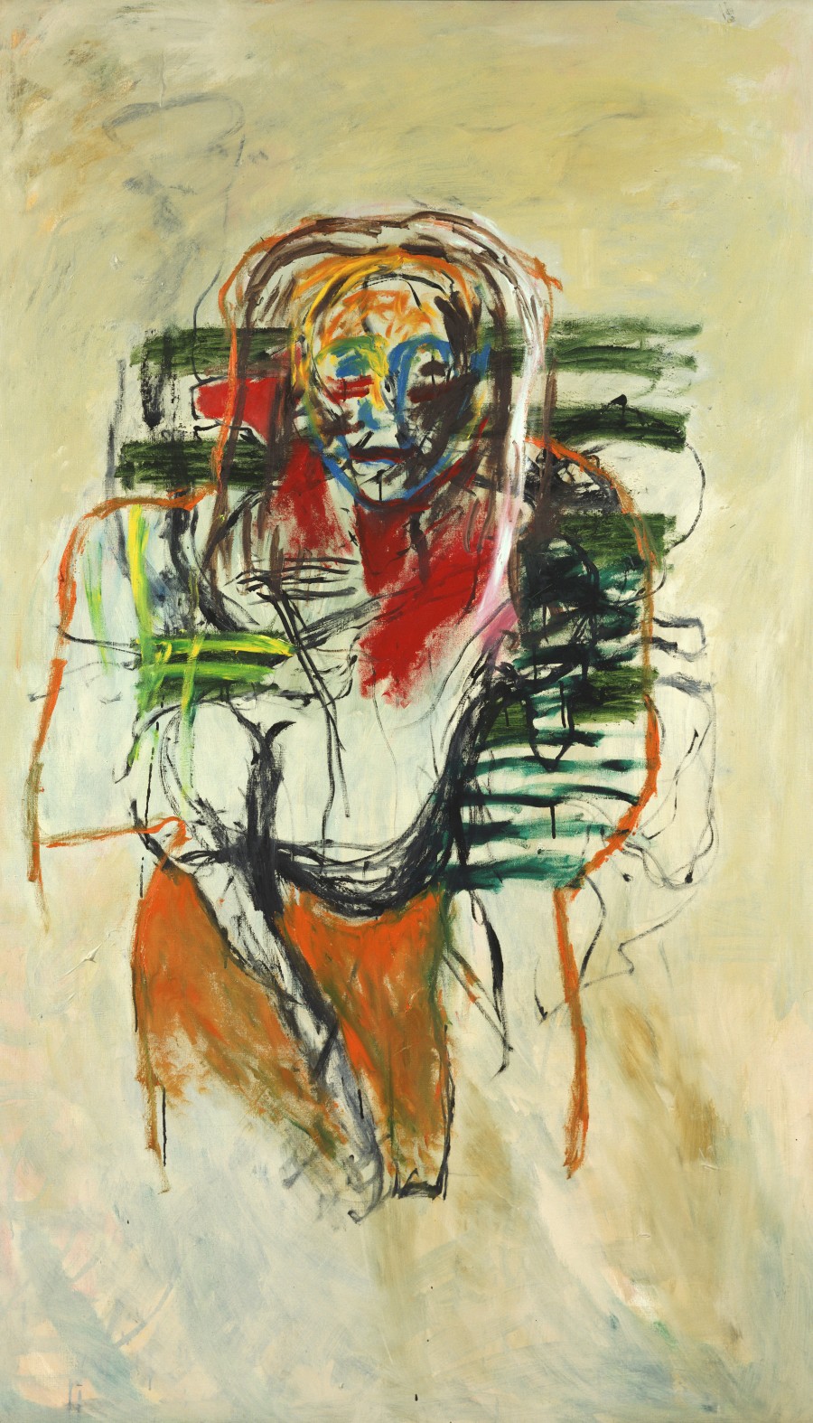 La figura de una mujer diseñada con formas imprecisas, inacabadas, rostro gesticulante, rayas y manchas, destaca sobre un fondo neutro, como si de una pared se tratara. El rasgueo y los colores, confieren al personaje un aspecto tétrico, impactante, con la emoción de lo inmediato, y aparentemente fortuito, que le da la técnica empleada por el pintor.