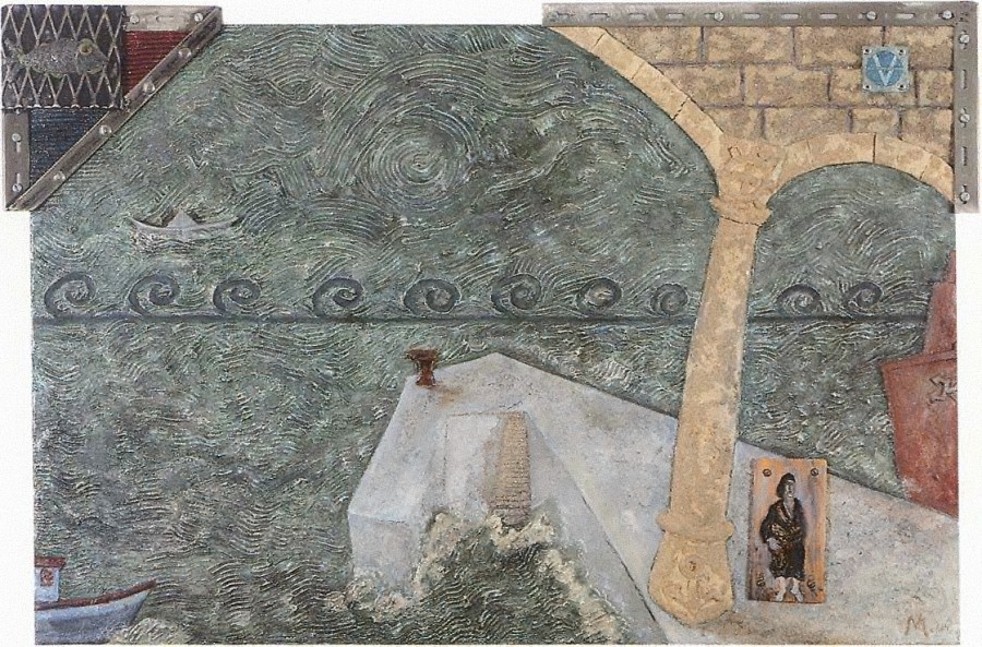 A través del fragmento de una arcada de piedra contemplamos el mar, por donde navega un barquito plateado, muy cerca de la espiral que se genera en el centro del cuadro. La arquitectura se introduce en la composición, de forma inclinada, e inestable, como si se tratara de un efecto óptico provocado por el movimiento del agua. Sobre el pantalán resalta una pequeña figura femenina descalza, que se incorpora al cuadro como una visión, como un recuerdo. El pintor integra en la obra una serie de elementos reales añadidos, producidos industrialmente, colocándose en la línea que habían abierto los cubistas, enlazando con Duchamp, sin que la obra llegue a perder el carácter ilusorio del cuadro. La espiral es uno de los signos que, procediendo de la simbología popular, el artista recupera pasando a formar parte de su iconografía personal.