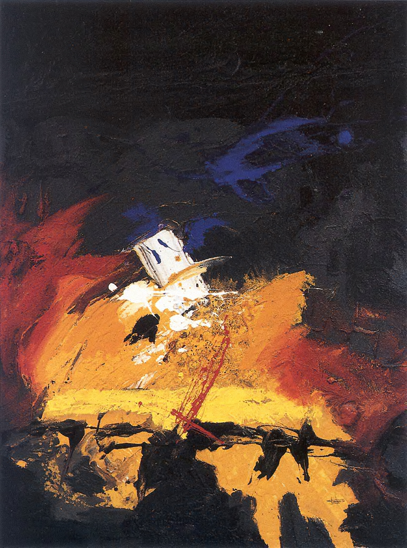 Parte de negros que cubren el fondo del cuadro, y, con brochazos morados nos conduce hacia anaranjados, ocres, amarillos rojos y blancos que irrumpen con fuerza colocándonos en la sima de un volcán. Juegan con gestos y texturas y sin abandonarse a ellas, con armonías cromáticas, nos lleva hacia la luz.
