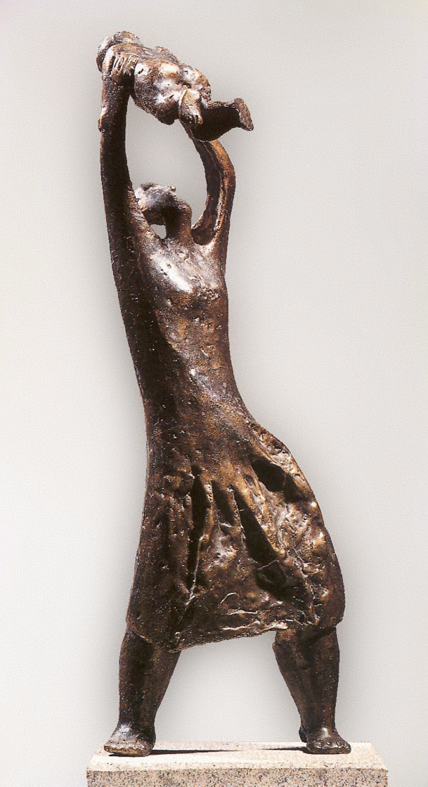 Este tema recurrente en el artista es siempre interesante por las variadas versiones que de él nos ofrece. La figura, de pie con las piernas separadas, levanta al niño en el aire a la vez que incurva su cuerpo para mantener el equilibrio. Un juego cotidiano se convierte en un acontecimiento rico en matices psicológicos, agudizados por el ir y venir de la luz que penetra entre los dos cuerpos, creando un espacio de comunicación íntima entre madre e hijo.