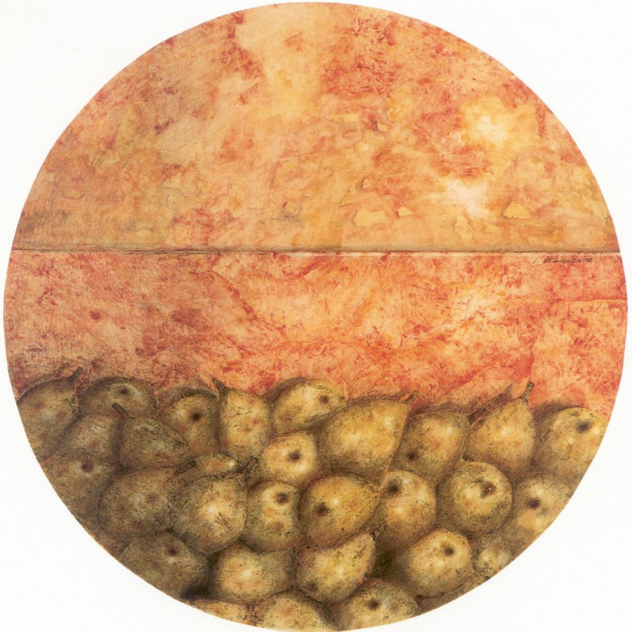 Las peras se acumulan, amontonadas, en la parte inferior de un círculo que las engloba y protege, como un fanal que atenúa y matiza la luz, creando una atmósfera mágica y entrañable en torno a objetos cotidianos. La levedad de los colores y el sutil tratamiento de la materia, sensibilizan la composición, que se incluye dentro de la serie «Cotidiáns».