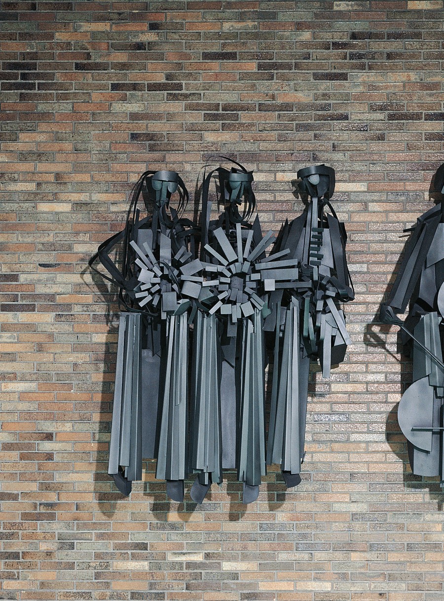 Con solemne empaque se cuelga de la pared un grupo de tres figuras sentadas, acompañadas de instrumentos musicales. Los personajes, definidos de forma esquemática, apoyan los labios en las boquillas de los instrumentos cuyo pabellón acampanado se rompe en tiras de distinto tamaño, con el efecto radial de los rayos solares. El enlace entre las formas más definidas y los gestos más libres se realza a través de sombras de estudiada eficacia estructural.