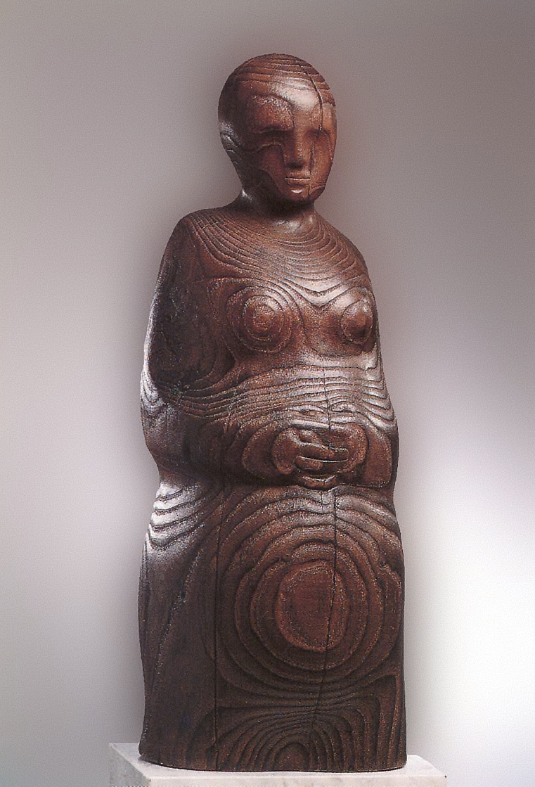 Figura cortada por la rodilla, tallada con formas suaves que ponen en evidencia la textura peculiar de la madera, aprovechada en sus máximas posibilidades expresivas. Las vetas del material producen la sensación de una vestimenta transparente con múltiples pliegues redondeados, tras lo que se descubren las formas corporales de la mujer. Una carga espiritual, imbuida de cierto misticismo, envuelve a la figura.