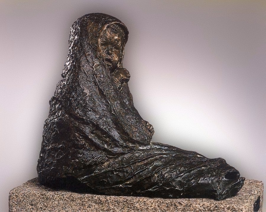 Sentado en el suelo, se envuelve en un manto que oculta su cuerpo del que sólo asoman el rostro, una mano y un pie. La tela subraya el perfil de la figura que se estrecha hacia los pies con un arrugamiento en el que se concentran todas las líneas de fuerza de la masa escultórica. La excelente valoración del material, la delicadeza de ejecución y la expresión del niño superan el sentimentalismo que pudiera desprenderse del tema.