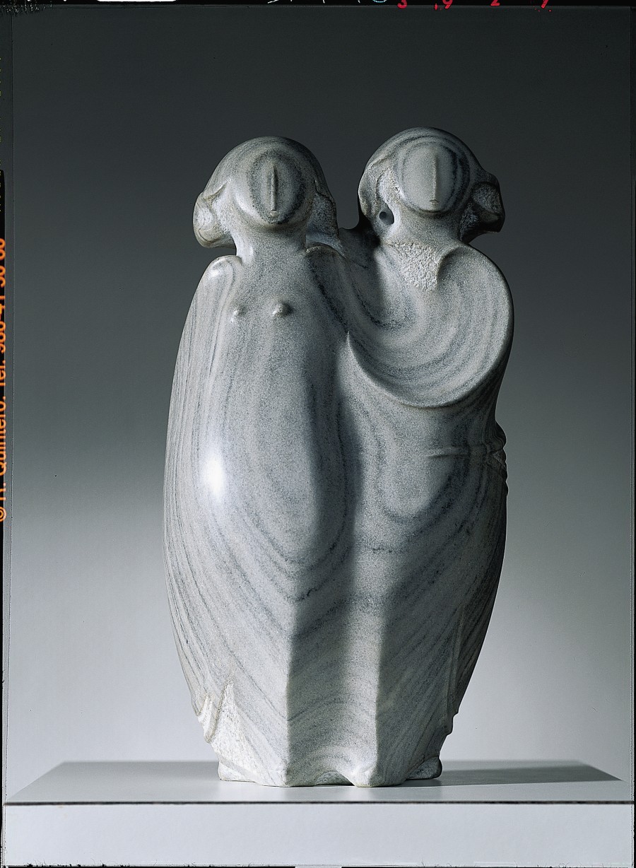 Las dos figuras unidas en el mismo bloque han sido reducidas a lo esencial en una pieza en la que predomina el macizo y el sentido curvilíneo y cerrado de los volúmenes. Las vetas de la piedra configuran los rostros y realzan los pliegues de las telas en un conjunto estilizado, de formas suaves y textura pulida que alterna con pequeñas zonas en donde luce el picado rugoso de la piedra en un conjunto escultórico impregnado de lirismo