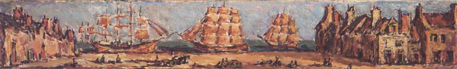 El singular formato, largo y estrecho, proporciona gran atractivo a la composición, cerrada en sus bordes laterales por bloques de edificios que convergen ligeramente hacia el fondo, en donde destacan, sobre el mar, tres navíos de hermoso velamen. Pequeñas figuras se mueven en el centro, con un reducido papel puntual de color y ambientación. Dominan ocres y rojizos que juegan con verdes, azules y negros, a los que hay que añadir pequeños toques blancos que producen una vibración lumínica por toda la tela.Exposiciones
