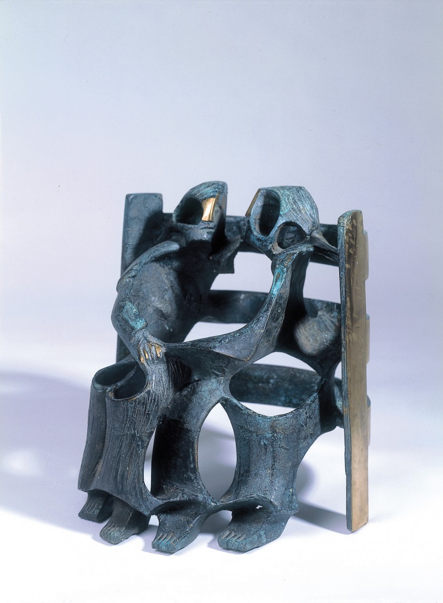 Los cuerpos y el asiento se funden en una solución de continuidad creando un armazón que circunda el espacio, que a su vez envuelve a la escultura en una mutua dependencia que da vida al conjunto, jugando con el pictoricismo de la pátina y el acabado brillante del bronce.