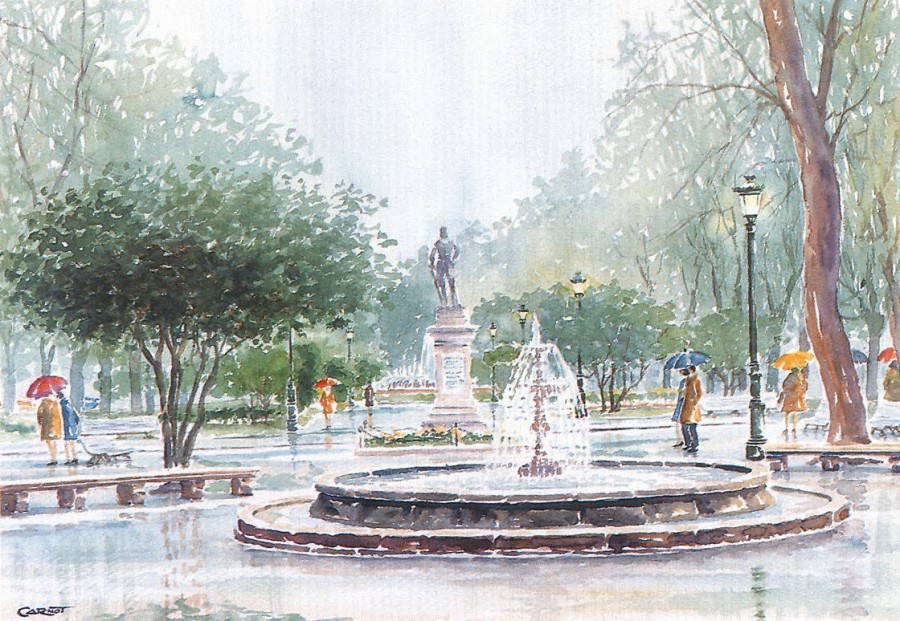 Perspectiva de la Alameda de Vigo con la estatua de Méndez Núñez en el centro, el estanque en primer término y árboles frondosos con las copas expandidas sobre el cielo. El paisaje se anima con pequeñas figuras que cruzan la plaza protegidas con paraguas. El artista escoge un día de lluvia que le permite jugar con los reflejos de la luz sobre el suelo mojado, dotando a la composición de cierta vitalidad.