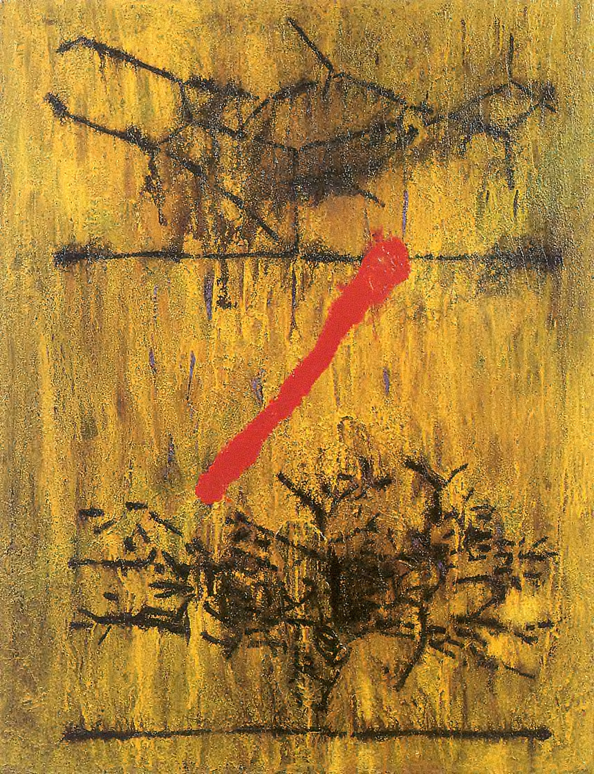 Sobre una superficie rugosa, impregnada de pigmentos verdes y amarillos, resalta el armazón de dos árboles en negro y, entre ellos, un grueso trazo rojo sesgado. El pintor plasma un espacio sin límites en donde la sencillez de las formas sólo encuentra referencia en la pintura oriental. Como en un pictograma chino, representa, de un modo abstracto, con la mínima grafía, lo que quiere decir. Porque entiende la pintura como una filosofía, deja la obra abierta, para que cada uno pueda poner en marcha sus pensamientos con toda libertad.