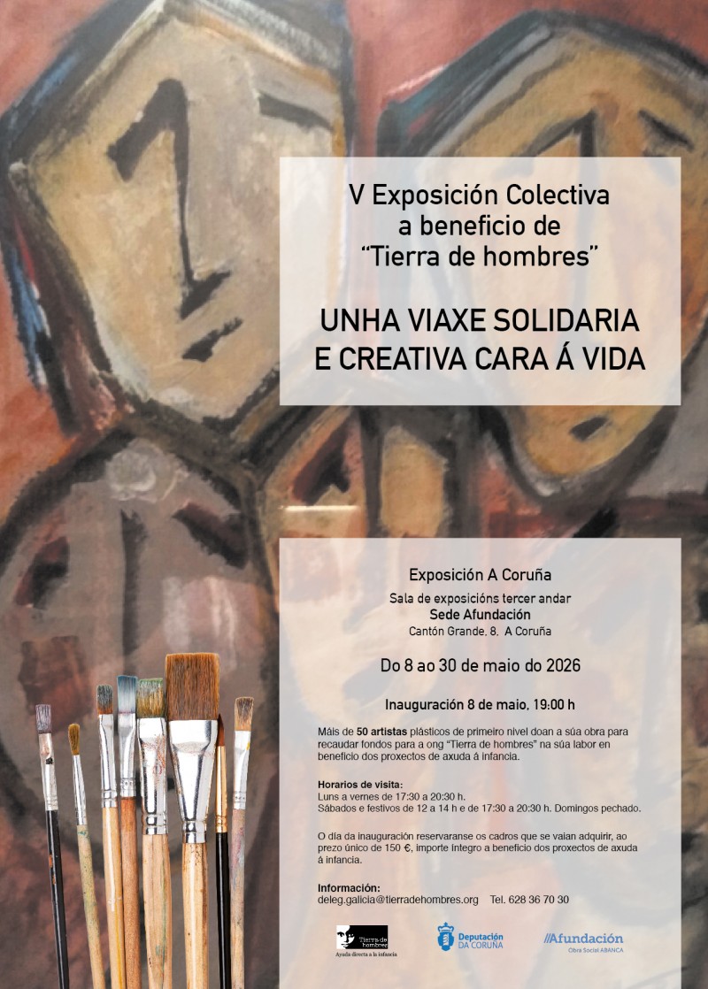 Na Sede Afundación A Coruña, acollemos do 8 ao 30 de maio a V Exposición Colectiva «Unha viaxe solidaria e creativa cara á vida», en colaboración coa ONG Tierra de Hombres. Un ano máis, colaboramos con este proxecto expositivo no que participan máis de cincuenta artistas de pintura, escultura e fotografía de Galicia para recadar fondos en beneficio do programa «Viaxe cara á Vida» organizado pola ONG. A exposición, coordinada por Francis Marrouch, reúne obras de artistas como Amelia Secas, Ana Lamuño, Carlos Botana, Diego Pérez Dopico, Eva Quián, Lola Uriel, Noemí Penela, Paco Ascón, Pilar Cancio ou Tino Poza, entre moitos outros.