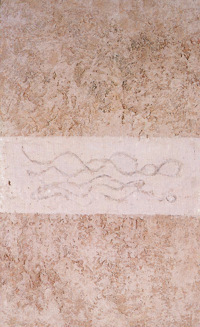 Unha textura grumosa, de cor abrancazada, cobre a superficie da tea, da que emerxe con gran espesor. É unha materia porosa, matizada cun ton café con leite, que lle dá ao cadro un determinado ambiente emocional. Sobre este inmenso vacío destaca unha franxa de luz cun grafismo, cun ritmo curvilíneo, inciso na materia como un petroglifo. A pintora provoca unha reflexión opoñendo á inmensidade da nada a forza do espírito.Reproducciones