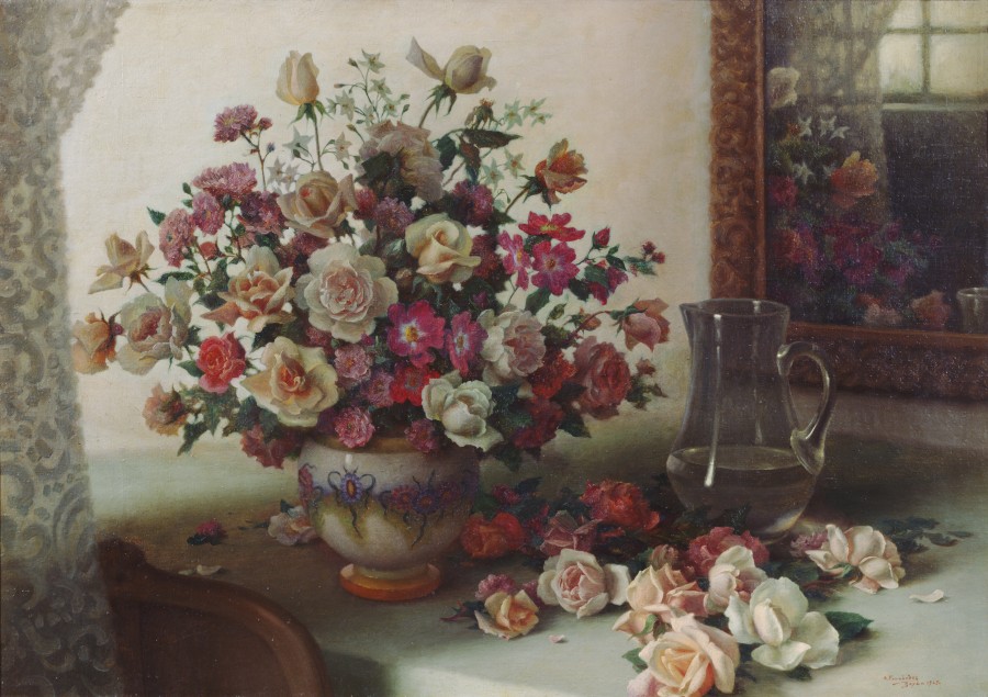 Cun encadre nesgado e fragmentadrio introdúcenos nun espacio interior que enmarca unha cortina. Un floreiro, flores soltas e desfolladas, e unha xerra con auga distribúense, de xeito ordenado, encol dunha mesa e refléctese no espello da parede a través da cal percibimos parte da habitación que non vemos. Este artificio escénico crea unha ambigüidade óptica entre a realidade e a ficción que, unido ó detalle das rosas caídas arriba da mesa, lle dá un acento simbólico á pintura. O artista conxuga o detallismo do debuxo coas calidades e reflexos que a luz activa.Bibliografía