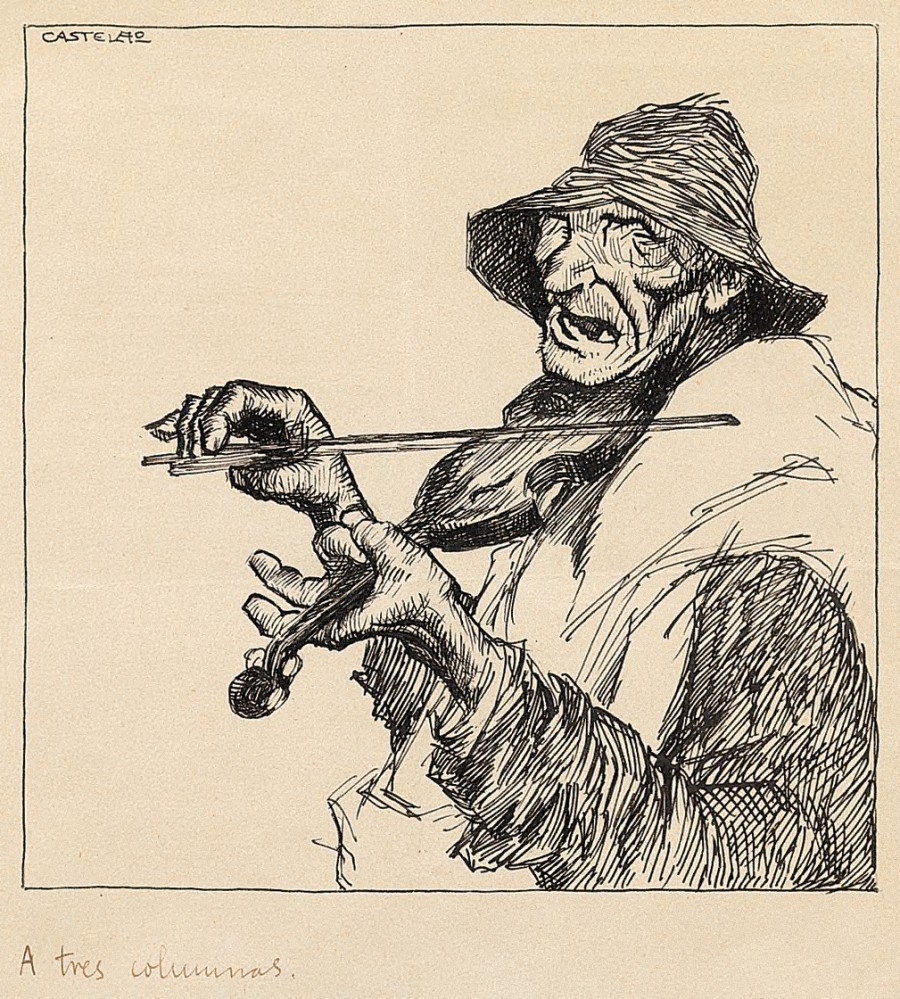 Apoiado nun ángulo da viñeta, un cego co sombreiro posto e a boca aberta, coma se estivese cantando, toca o violín.