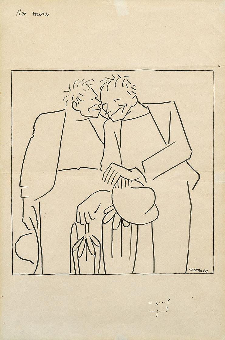 Na misa CASTELAO INV: 1228 Año de creación: 1920 - 1930 Dimensiones: 34 x 23 x 0 Técnica: Tinta/papel Comentarios Dous tipos, apoiados nuns paraugas, co sombreiro na man, están a bisbar na igrexa
