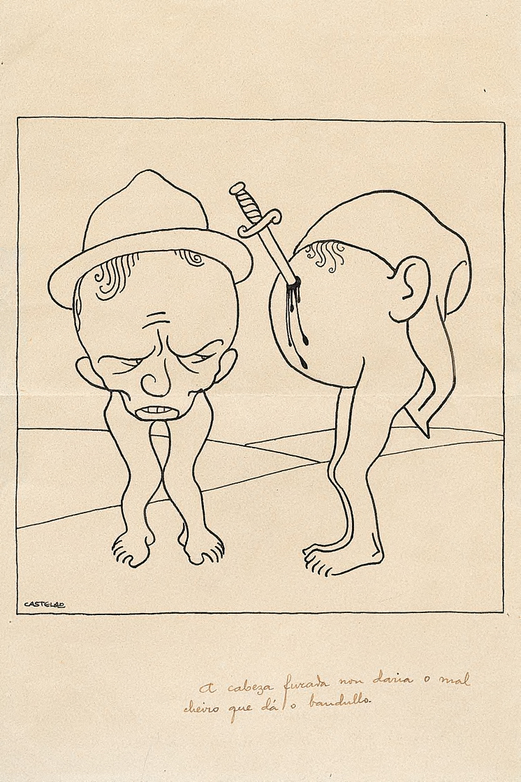 Sobre un fondo de paisaxe destaca, de fronte, unha cabeza con pernas e sombreiro ó lado dunha barriga, de perfil, con orellas e pernas e unha espada cravada no centro do ventre, chorreando sangue. Con precisión e agudeza expresa un pensamento satírico ilustrado cun expresivo debuxo.BIBLIOGRAFÍA: