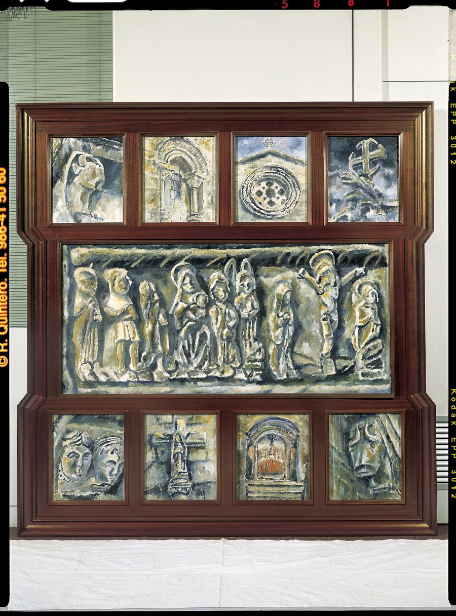 Do interese que o autor sente pola arquitectura popular galega xorde este retablo estructurado en tres corpos que representan diferentes elementos arquitectónicos e iconográficos inspirados na igrexa de Pedre. Situada no concello de Cerdedo, en Pontevedra, constitúe un dos conxuntos máis singulares da arquitectura galega.O corpo inferior componse de catro paneis. O panel da esquerda e o da dereita representan canzorros figurados que soportan os saíntes do tellado, un con dúas cabezas humanas e outro con cabeza de touro. Os paneis centrais resérvanse para a mostra de imaxes propias da iconografía popular coma os cruceiros e os petos de ánimas.