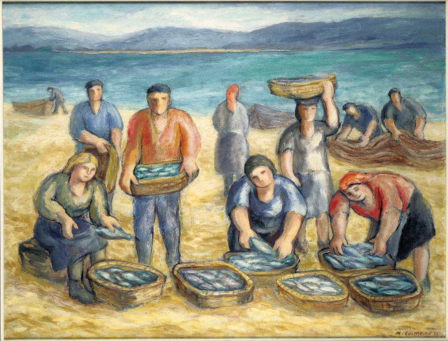 A praia anímase ó solpor á volta da pesca; uns recollen as redes e outros transportan as cestas, que, cheas de peixe, se aliñan en primeiro termo. Non é unha escena costumista senón a evocación dun traballo cotián nun contorno mariñeiro. Algunhas personaxes, silenciosas, reclaman, nas súas actitudes, unha condición simbólica. O debuxo preciso, a cor delicada e o gusto polas angulosidades escultóricas coordínanse, perfilando as figuras sobre a area cunha harmónica relación entre elas e mailo espacio que as circunda.Exposiciones