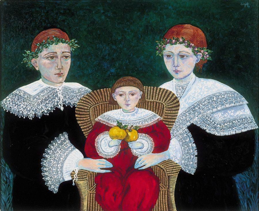 Un dos temas preferidos da pintora son os retratos de familia coas figuras cortadas polo bordo inferior do cadro, idealizadas con traxes e adornos froito da súa fantasía. Concisa e rigorosa no debuxo, esmérase nos detalles, reproducindo con grande virtuosismo os encaixes do colo e bocamanga e a textura da cadeira con brazos de vimbio sobre o que está sentada a nena. A austeridade do vestiario dos pais lémbranos os retratos dos personaxes pintados polos artistas do século XVII.