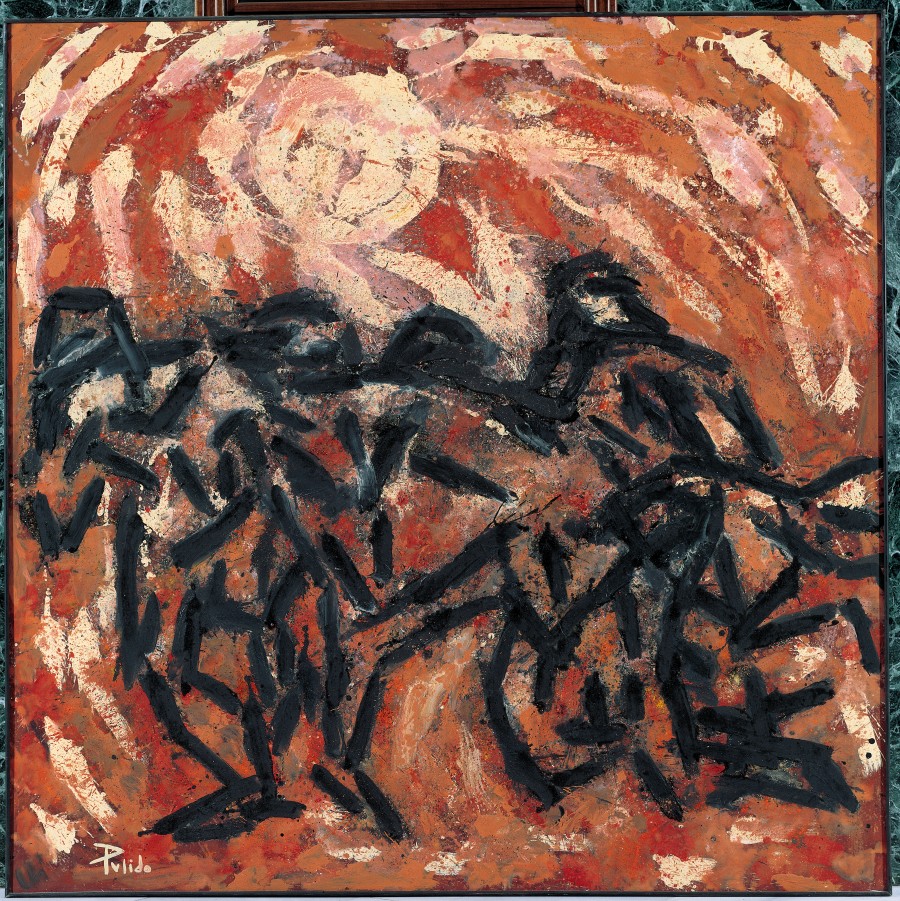 Pulido define coas cores e os trazos movementos e formas que se liberan de ataduras obxectivas. Os trazos negros que organizan a superficie parecen símbolos pictográficos dun antigo xeroglífico, pero se nos afastamos vemos que son siluetas de figuras que se moven e bailan baixo o sol que escintila na parte superior do cadro. Son personaxes individualizados que forman un vivo formigueiro sobre o fondo da composición, integrando o gráfico e o especificamente plástico nunha versión persoal do bulicio da festa.Bibliografía