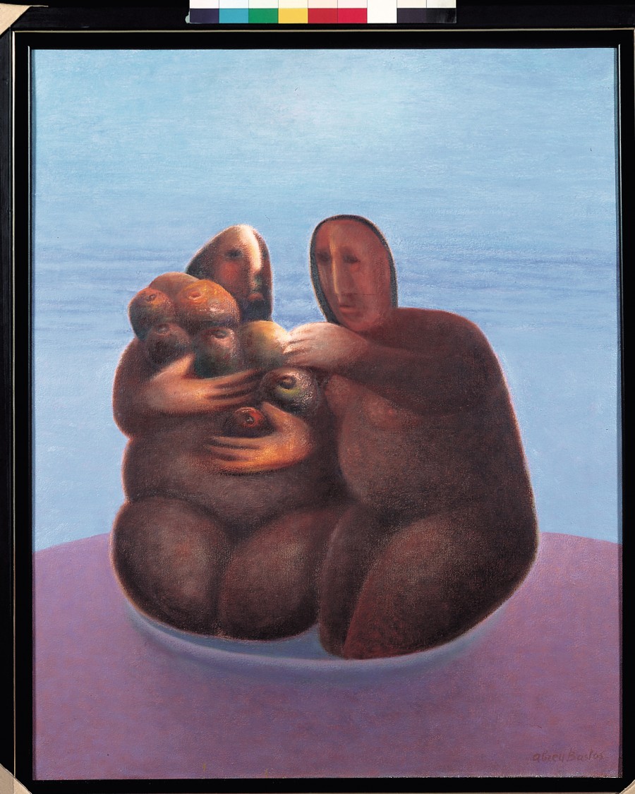 As figuras, de formas esenciais, escultóricas e sólidas, semellan inamovibles, ancoradas nunha dimensión metafísica, nun universo cheo de harmonía, concibido en envolventes tons rosas e azuis que contrastan coas tonalidades terras dos corpos graníticos que sosteñen as froitas zumentas, dunha intensa cor alaranxada.