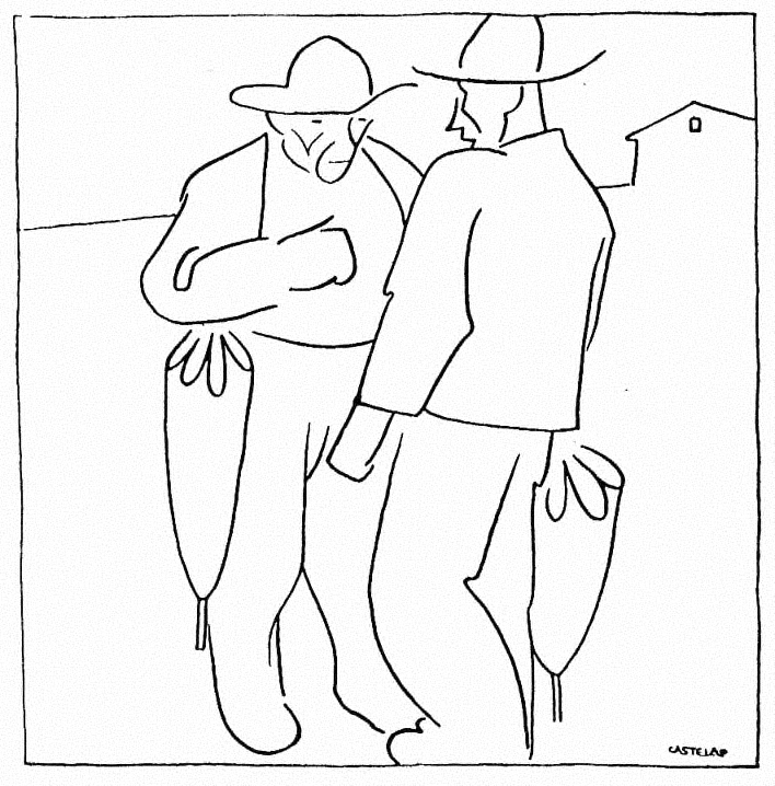 A escena recolle a conversa de dous tipos populares, configurados con grandes sombreiros e paraugas. Con extraordinaria habilidade coloca o personaxe da dereita con ritmo basculante sobre o bordo do recadro, no que queda perfectamente encaixado. O humor socarrón do pobo traslócese a través do texto.Reproducciones