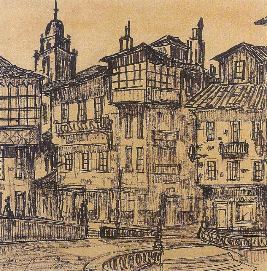 O pintor sitúase na parte inferior da composición, contrapoñendo a escaleira que dá acceso á igrexa de San Martiño Pinario e a torre de San Miguel que asoma por riba dos tellados. O debuxo destaca, en negro, sobre o ton marelado que cobre a superficie da táboa.Reproducciones