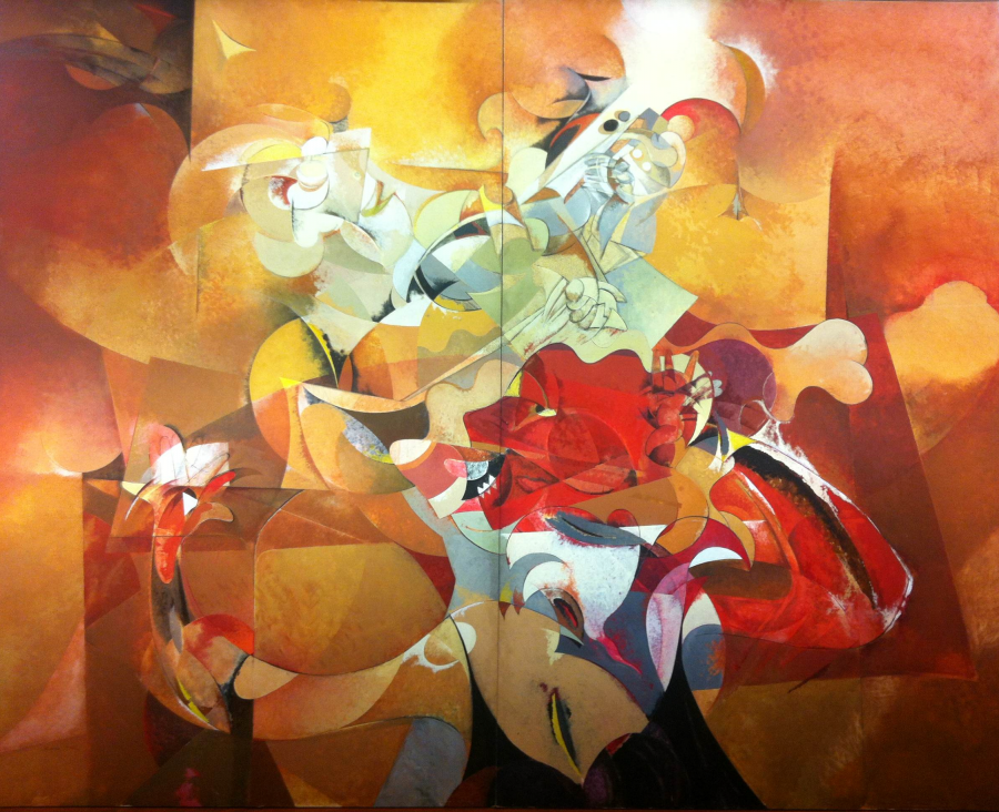 Concierto RAFAEL ÚBEDA INV: 4804 Año de creación: 1995 Dimensiones: 250 x 320 Técnica: Técnica mixta sobre táboa