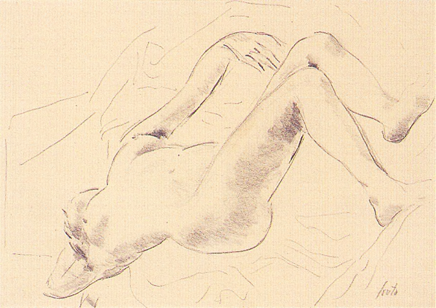 En difícil e complicada postura atravesa o papel dun lado a outro, deitada boca arriba, deixando caer a cabeza cara atrás, apoiándoa, en escorzo, sobre o brazo dereito, mentres pousa o esquerdo, sen tensión, sobre a roupaxe da cama. No deseño tívose en conta distintos puntos de vista, de forma que podería verse a figura en varias perspectivas, sen romper a unidade da composición, deixando patente a súa excelente condición de debuxante.