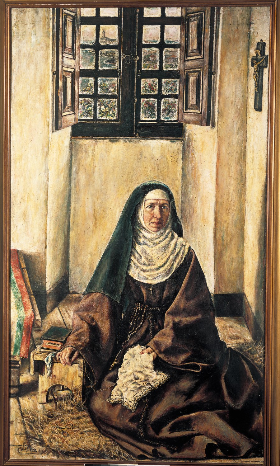 Por esta obra concedéuselle a primeira das segundas medallas na Exposición de Belas Artes, Madrid 1943.Sentada no chan do seu cuarto, destaca a figura en primeiro termo, enmarcada polas arestas da parede entre as que encaixa a ventá do fondo. A pequena figura faise meirande cos hábitos, que se engurran e pregan con espléndidos efectos de luz e textura. Créanse os elementos de ambientación, a cama de táboas, o libro, o flaxelo; saborea os detalles, o fío que pendura da agulla, as tesoiras e o bordado, conseguindo unha atmosfera acougada, que, lonxe do frío ascetismo, nos achega a unha doce espiritualidade. Excelente artista, profundiza na expresión da modelo, da que o carácter resulta evidente. Domina o marrón con entoacións ocres, sobre as que sobresae o resplandecente branco da rocha e do pano.